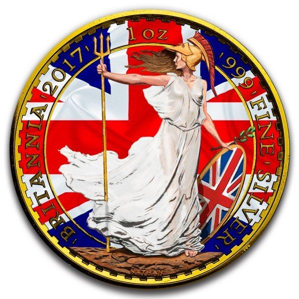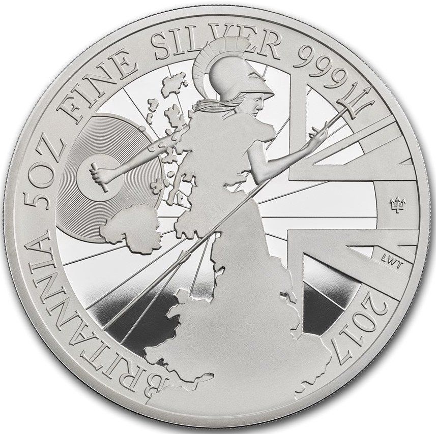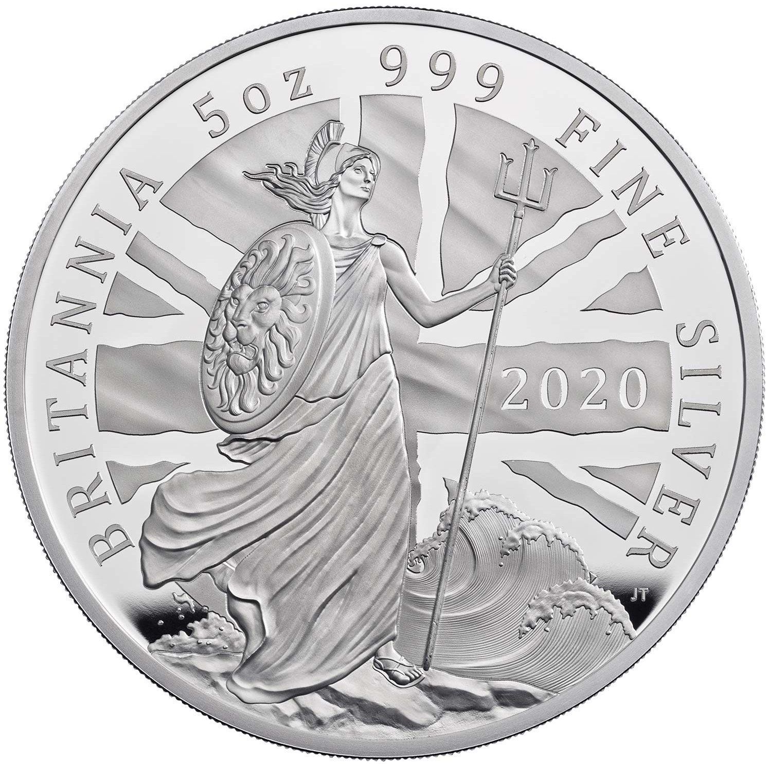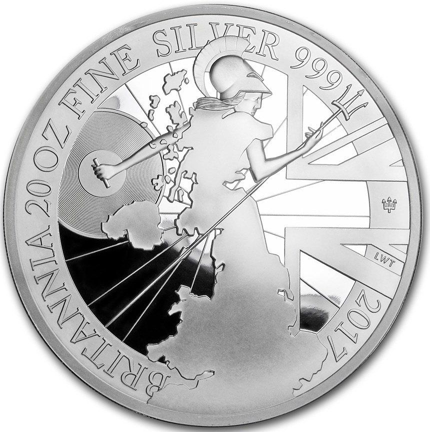 2017 saw the first silver twenty-ounce coin issued in the United Kingdom; it was released to mark the twentieth anniversary of the silver Britannia range. The obverse features the classic effigy of Her Majesty, Queen Elizabeth II. The reverse features Britannia with Corinthian Helmet, shield and trident. Her body is comprised of the map of England, Scotland and Northern Ireland. This issue has the special 20th Anniversary Trident Privy mark located prominently to the right of Britannia.