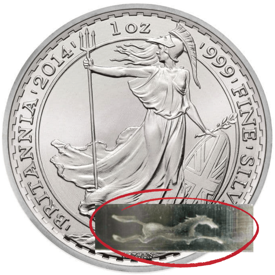Some 2014 silver Britannia coins were struck with the incorrect obverse as there was a mix up during the manufacturing process with the 'Lunar' Year of the Horse coins from The Royal Mint, as both coins were to the same fineness and specification, and similar but not identical obverse sides. It is thought that there are around 17,000 examples with the mis-strike, which have been dubbed the 'Mule Britannia'