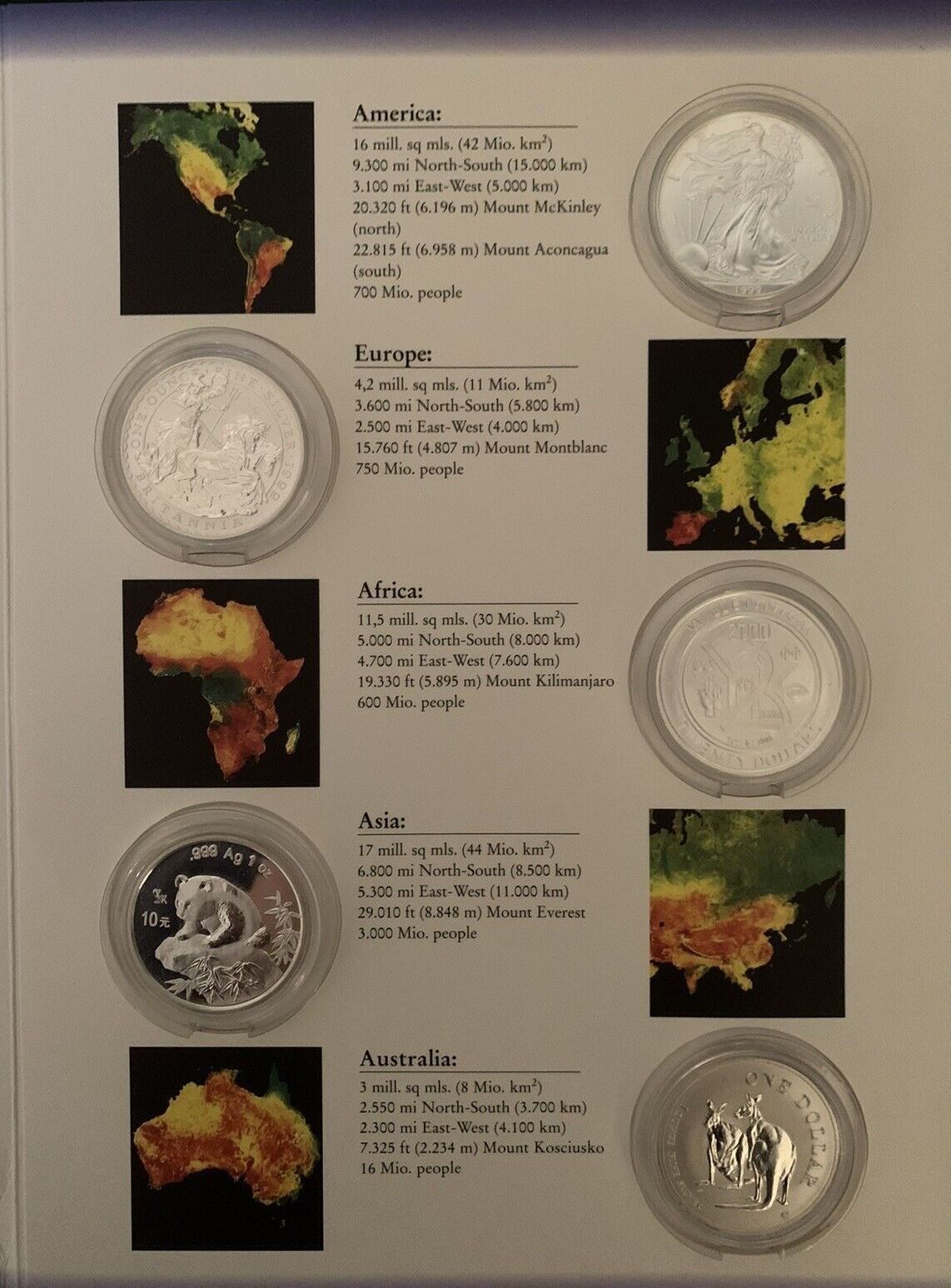 Pictured below are the 1 oz coins, the same designs were also available as fractional proof coins, including 1/2 oz, 1/4 oz and 1/10 oz.