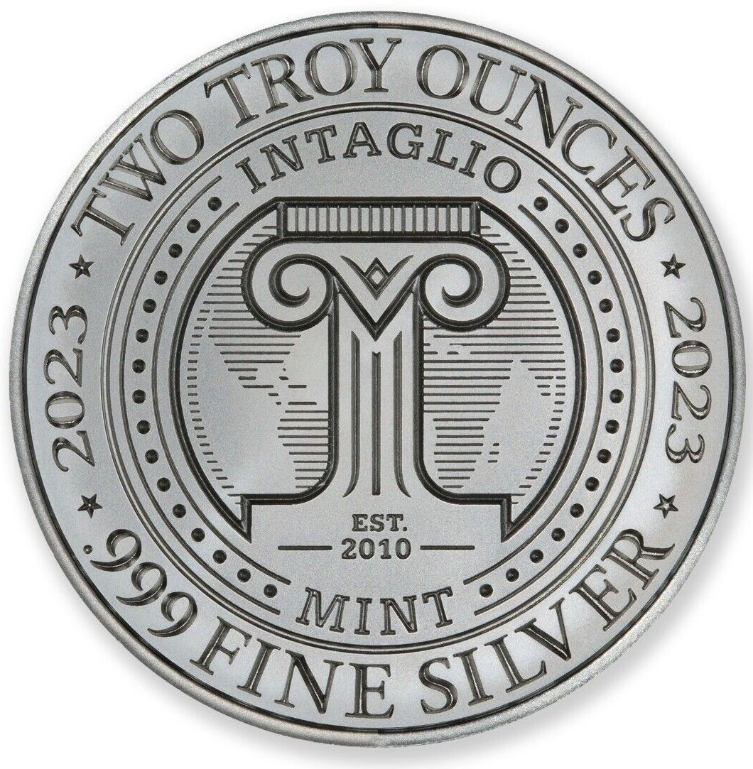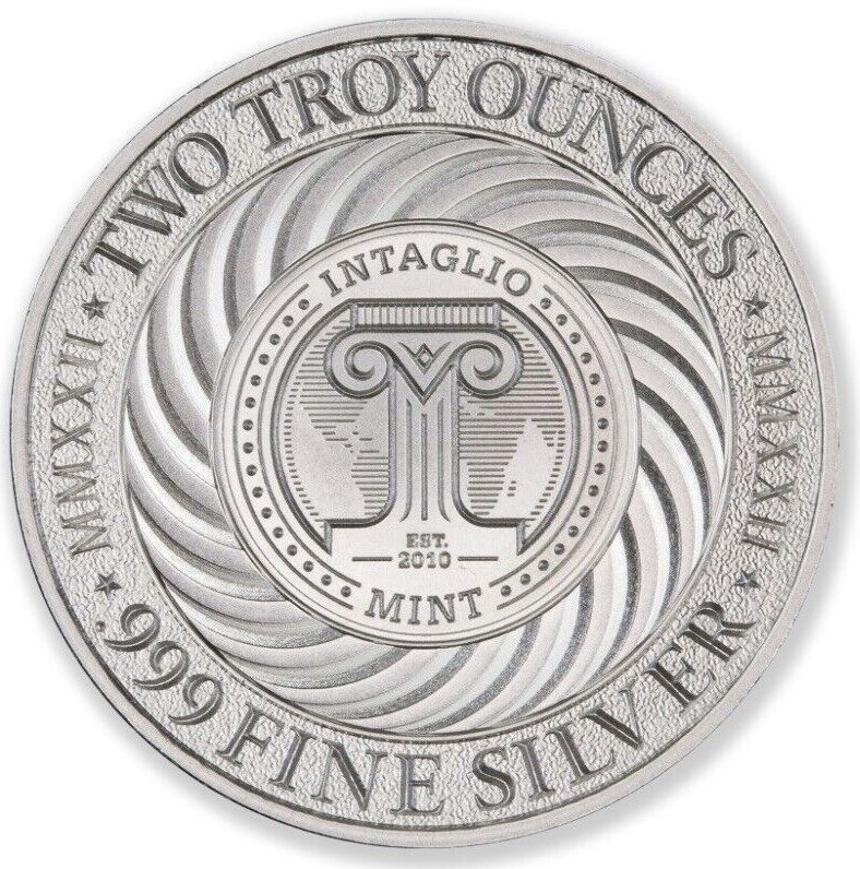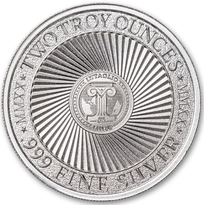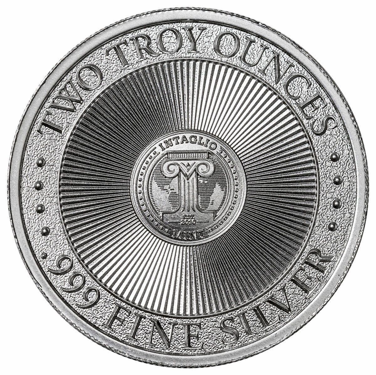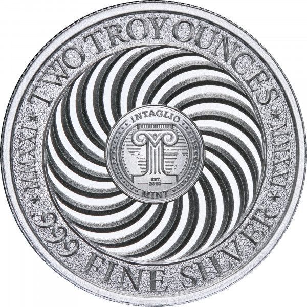 Intaglio Mint logo set on radial burst surrounded by stippled border reading “ONE TROY OUNCE” or “TWO TROY OUNCE” above and “.999 FINE SILVER” below on textured background.